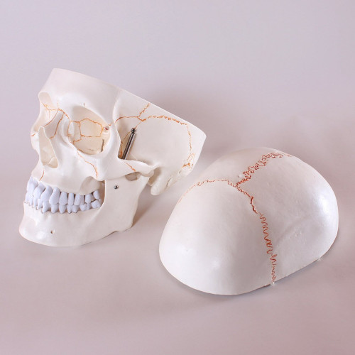 It can be disassembled into 3-part: Calvaria, Base of Skull, and Mandible. The calvaria is removable to show the internal structure of the skull. Mandible of skull is mounted on a spring to easily demonstrate natural movement.
