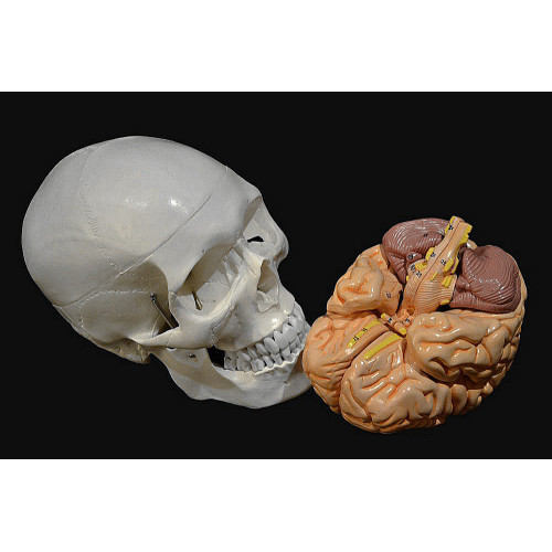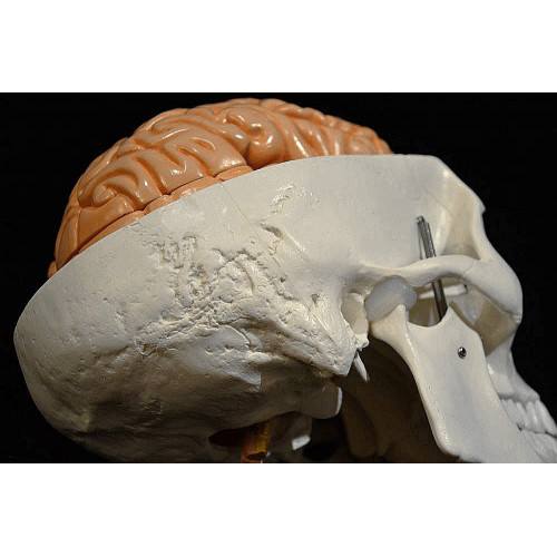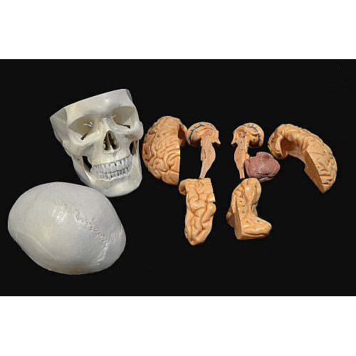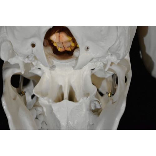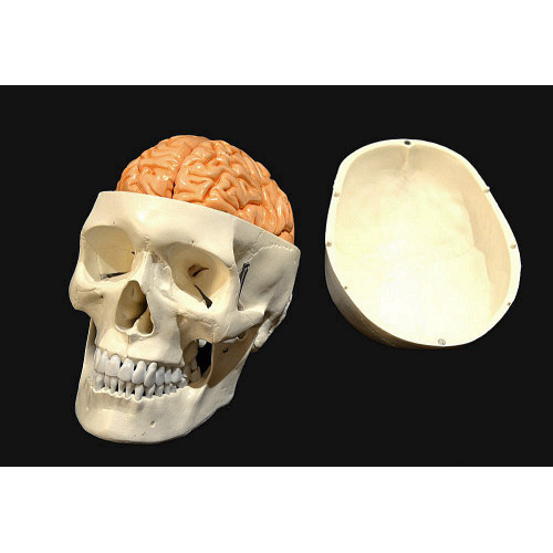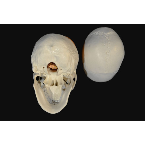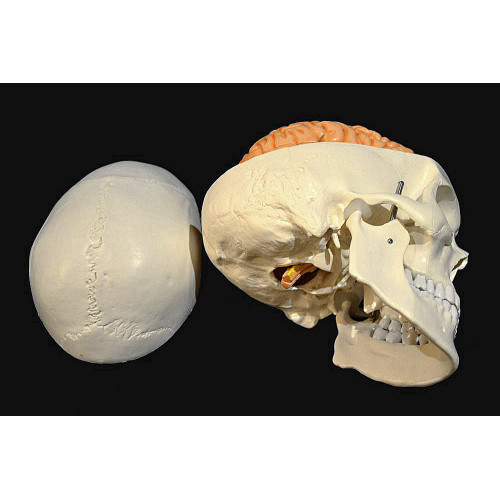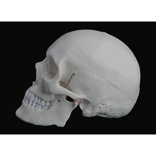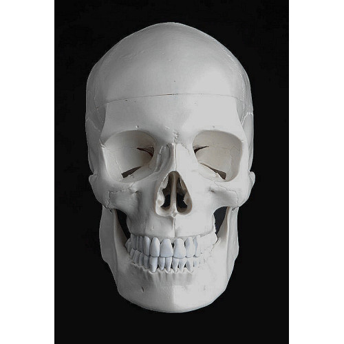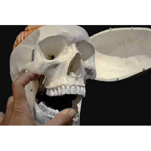 The skull is 3-part: Calvaria, Base of Skull, and Mandible. The calvaria is removable to show the internal structure of the skull. The mandible is articulated on springs to demonstrate natural movements. All of the joints, sutures, fissures, foramen, and styloid processes are highly accurate.