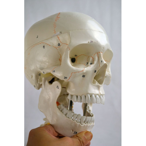 The skull is 3-part, with bones numbered on the right side of the skull: Calvaria, Base of Skull, and Mandible. The calvaria is removable to show the internal structure of the skull. The mandible is articulated on springs to demonstrate natural movements. All of the joints, sutures, fissures, foramen, and styloid processes are highly accurate.