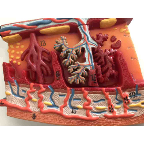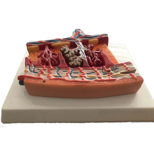 This cross-sectional model shows the inner structure of human placenta, displaying amniotic epithelial, chorion frondosum, villus, decidua basalis, umbilical cord, umbilical artery, umbilical veins, uterine vessels, uterine veins, uterine spiral arteries etc.
