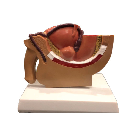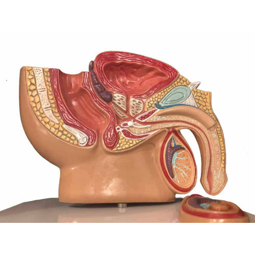 Near full size, mid-sagittal section showing the anatomy of the pelvis and prostate. Includes both normal and benign prostatic hyperplasia (BPH) insert. BPH insert shows increased size of prostate, urethral obstruction, urine retention, and thickening and distention of bladder.