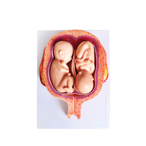 - E-III: 5th Month Twin Fetuses Normal Position -- The fetus is shown in a natural position within the uterus. The fetus can be removed for a closer inspection of the uterus.