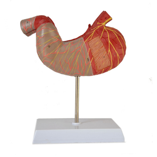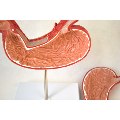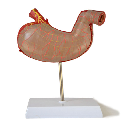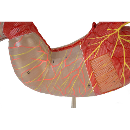 This model is dissected along the medial plane and can be opened to show the internal structure of the stomach, including the mucosa, the pylorus and a section of the gastric wall. Superficial dissections expose the longitudinal, circular and oblique muscle layers, with nerves and vascular structures.
