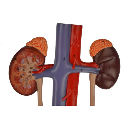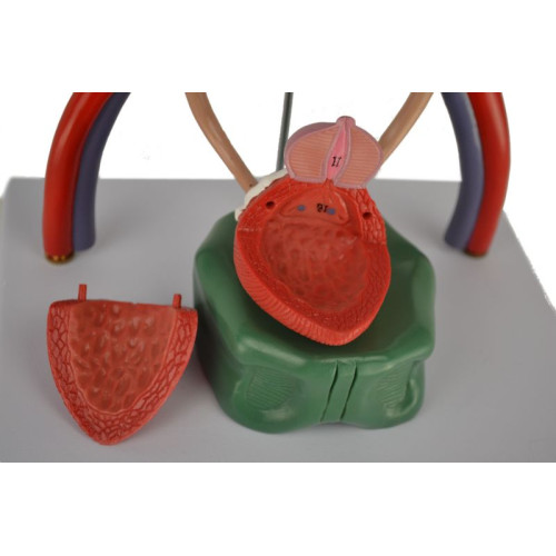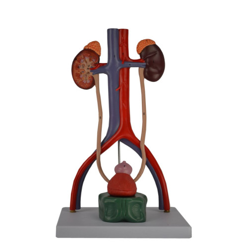 This model represents the major components of the urinary system. The right kidney is dissected to show cortex, medulla, renal pyramids, calyces, renal pelvis, renal artery and renal vein. The bladder can be removed and opened for detailed study.