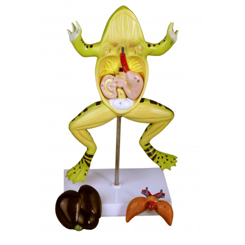This 3 times life-size model provides a highly accurate illustration of the morphology of a frog. The following parts are removable: Heart and lungs, liver and stomach, intestine. The ventral part is open to show great details of the thoracic and abdominal structures for a closer study of the inner anatomy, digestive system, excretory system and reproductive organs.